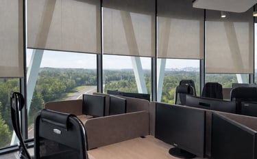 The installation allows centralized management, scenario-based operation, and seamless integration with the building’s automation infrastructure. Automated sun tracking, time schedules, and grouped control provide optimal comfort, energy efficiency, and precise daylight regulation across the entire workspace.